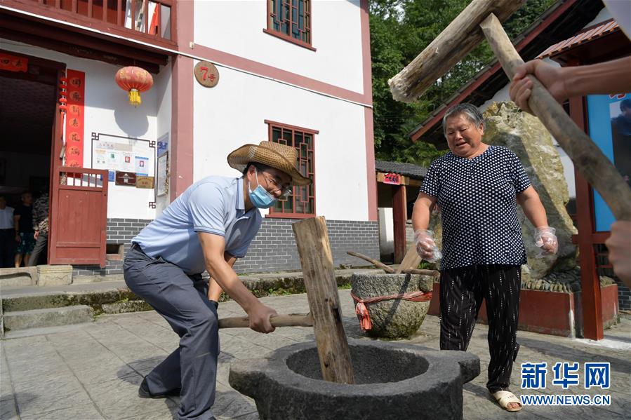 游客在神山村村民左秀发家体验手打糍粑(7月15日摄)。新华社记者 彭昭之 摄