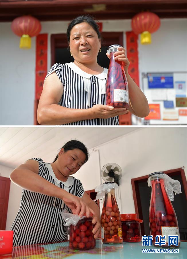 拼版照片:上图为神山村村民彭茶香在展示自家酿制的杨梅酒(7月15日摄);下图为神山村村民彭茶香在自己开办的农家乐内准备游客预订的杨梅酒(7月15日摄)。 新华社记者 彭昭之 摄