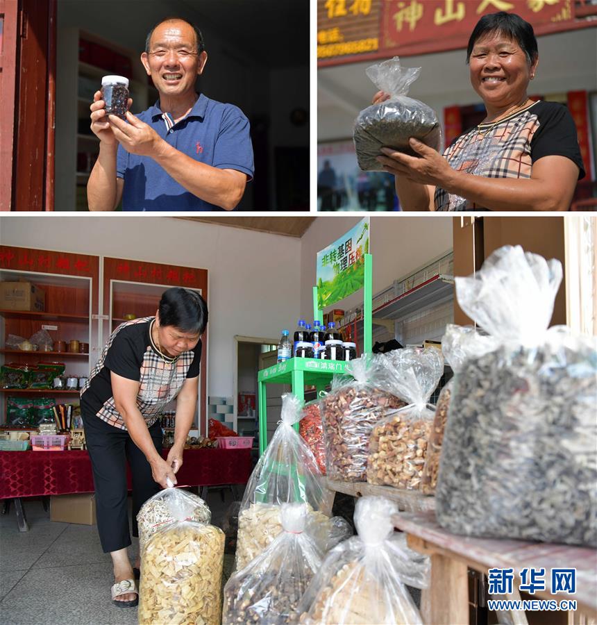 拼版照片:左上图为:神山村村民李宗吾在展示自家土特产商店销售的神山土产(7月15日摄);右上图为神山村村民黄甲英在展示自家土特产商店内销售的特产(7月15日摄);下图为神山村村民黄甲英在自家土特产商店整理商品(7月15日摄)。新华社记者 彭昭之 摄