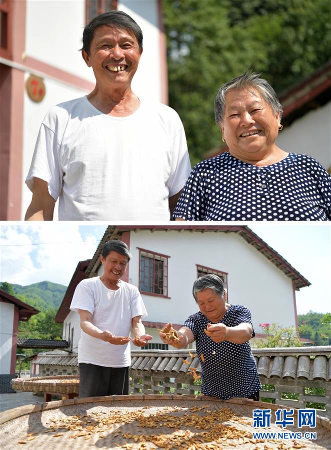拼版照片:上图为神山村村民左秀发和妻子彭冬莲的合影(7月15日摄);下图为神山村村民左秀发和妻子彭冬莲在自家院子里晾晒黄桃干(7月15日摄)。新华社记者 彭昭之 摄