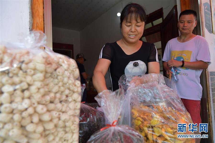 神山村村民张丽萍在自家开办的土特产商店销售黄桃干给游客(7月15日摄)。新华社记者 彭昭之 摄