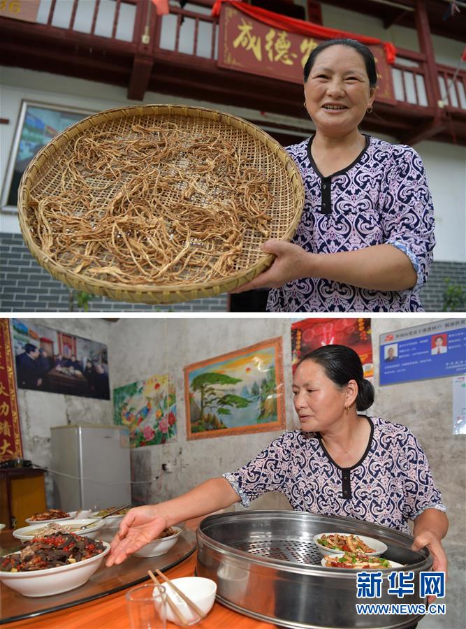 拼版照片:上图为神山村村民彭夏英在自己开办的农家乐内展示她家自制的干辣椒(7月15日摄); 下图为神山村村民彭夏英在农家乐内给游客们上菜(7月15日摄)。新华社记者 彭昭之 摄