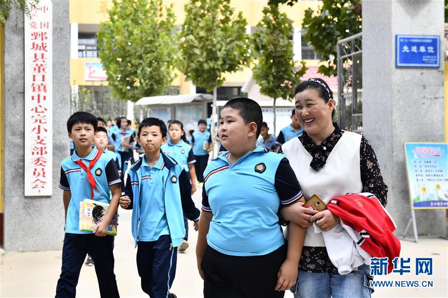 9月22日,在鄄城县董口镇中心完小,刘月娥(右一)中午接儿子张智放学。 新华社记者 王凯 摄