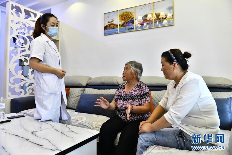 9月22日,在鄄城县董口镇黄河社区,家庭医生上门为刘月娥的婆婆李喜兰(中)检查身体,并叮嘱日常注意事项。新华社记者 王凯 摄
