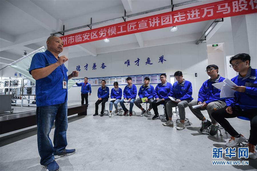 9月23日,全国劳模、 全国五一劳动奖章获得者叶金龙(左一)在给企业新进员工进行宣讲。 当日,劳模工匠宣讲团入企宣讲活动在浙江杭州市临安区青山湖科技城的浙江万马股份有限公司车间内举行。 今年以来,杭州市临安区总工会以推进产业工人队伍建设改革为契机,搭建劳模工匠宣讲团、技能专家课堂、职工普法讲堂等学教平台,组织劳模工匠、职工党员、技能人才等分批到企业开展读书、交流及技术培训,引导广大企业职工爱岗敬业、勇于奉献、积极提升岗位技能水平,推进产业发展。 新华社记者 徐昱 摄