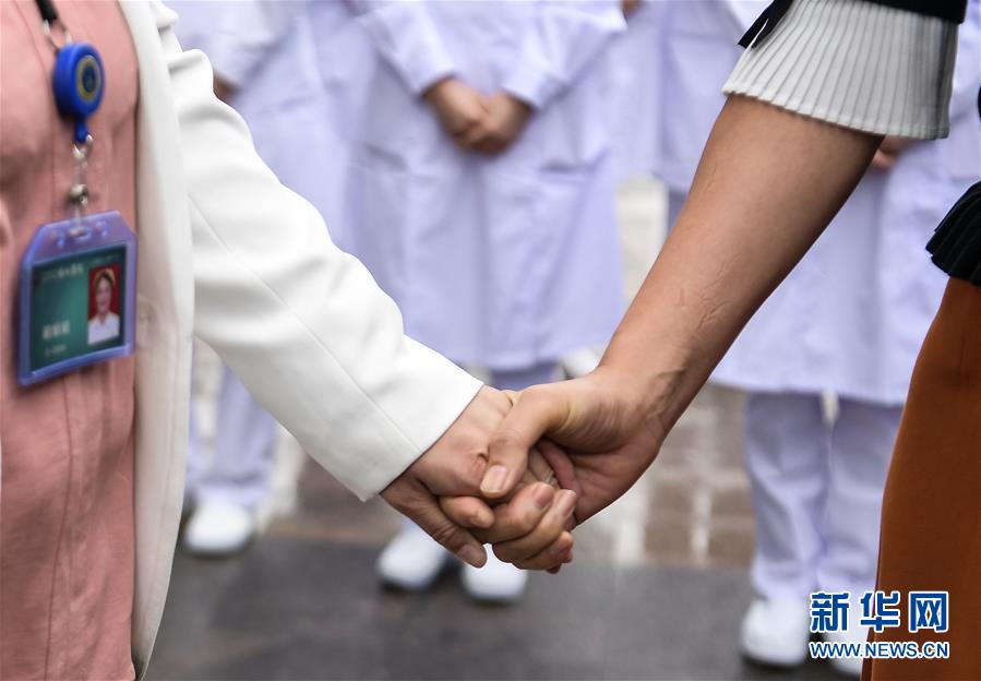 9月23日,来自北京中医医院的援鄂医疗队队员蔡卫敏(右)回访武汉协和医院西院,与该院耳鼻喉科护士长胡娟娟的手紧紧握在一起。 当日,10余名北京援鄂医护人员代表受邀回访武汉,在武汉协和医院西院和医疗队曾经的居住地,昔日的医疗队队员与武汉的抗疫“战友”重聚。 新华社记者 李贺 摄