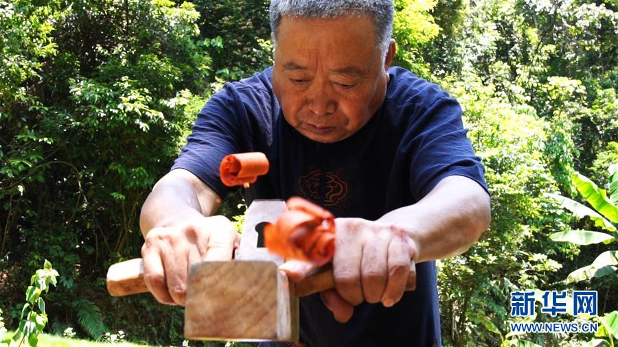 王德文在广西梧州市蒙山县陈塘镇刨木料(7月23日摄)。新华社记者 吴思思 摄