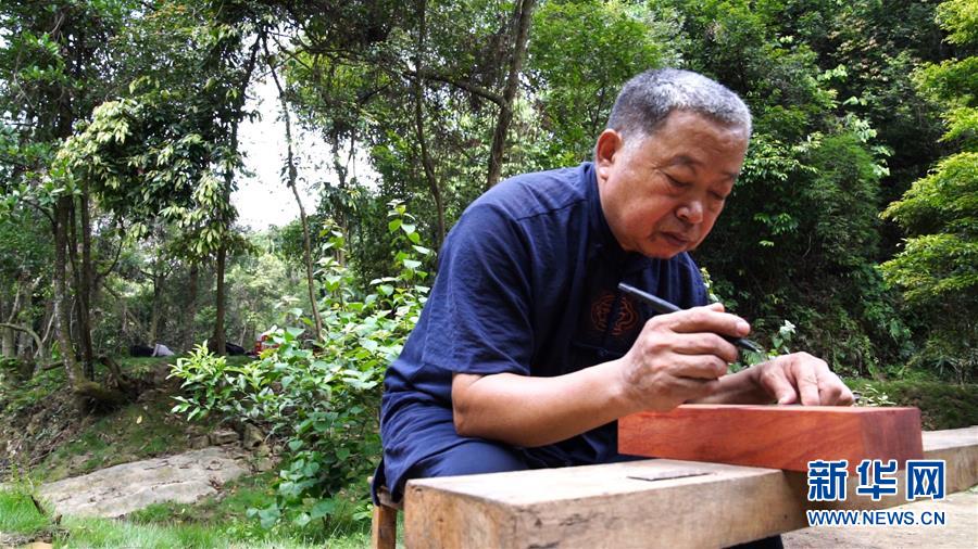 在广西梧州市蒙山县陈塘镇,王德文在木料上画线(7月23日摄)。新华社记者 吴思思 摄