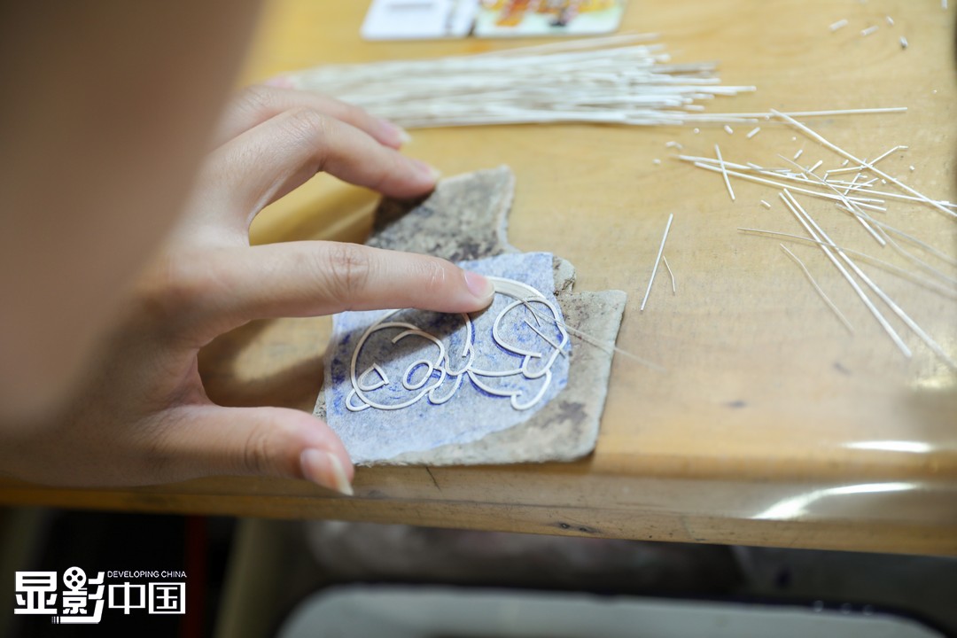 有了轮廓线,艺人们会将各种形状的花丝填在里面,构成精美的图案,这个步骤叫做填丝。
