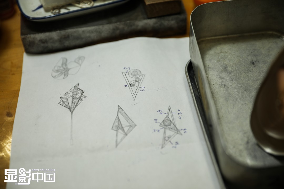 设计专业出身的王晓璐,目前主要负责原创首饰设计。小时候第一次看到由母亲独立制作的一幅名为《一帆风顺》的银丝画时,王晓璐被震撼了,同时她在心里种下了一颗关于银花丝的种子。王晓璐从高中开始学习绘画,大学时选择了旅游工艺品设计与制作专业,都是在为自己的“花丝细梦”做准备。图为王晓璐的设计图纸。