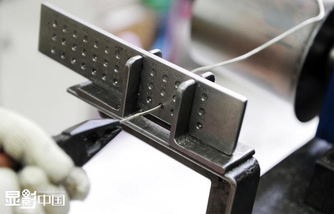 如果把银花丝制作比作刺绣,拉丝就相当于为绣娘们准备刺绣用的丝线。拉丝板上由粗到细排列着四五十个直径不同的眼孔,拉丝时必须由大到小依次通过每个眼孔,顺序不能随便跳过。一根一米长的筷子粗细的银条,通过100多道工序,可拉至1000米而不断,细度与头发丝差不多。(资料图,王晓璐提供)