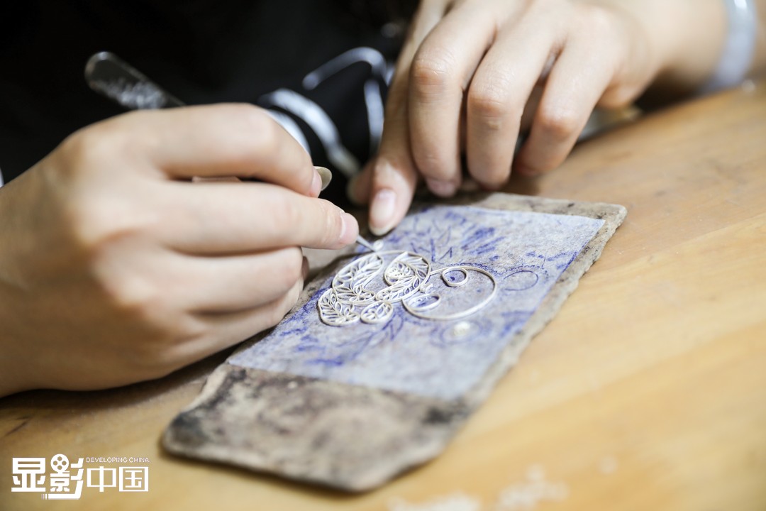 配丝完成后,就可以开始掐丝工序。掐丝指的是用掐丝镊子掐出作品需要的轮廓和纹样。这是银花丝制作技艺中的基本功,也是很难掌握的一门技术。手艺高超的花丝艺人可以用一根花丝掐制出复杂的图案,并且造型精确、栩栩如生。