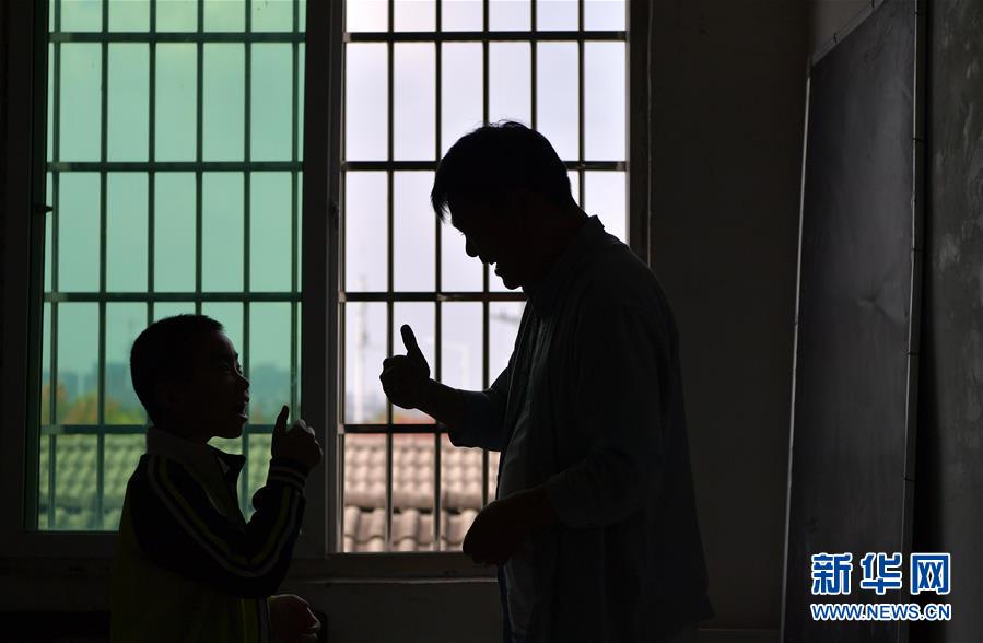 在南昌三联特殊教育学校,何彪在教一个孩子手语(9月24日摄)。 新华社记者 彭昭之 摄