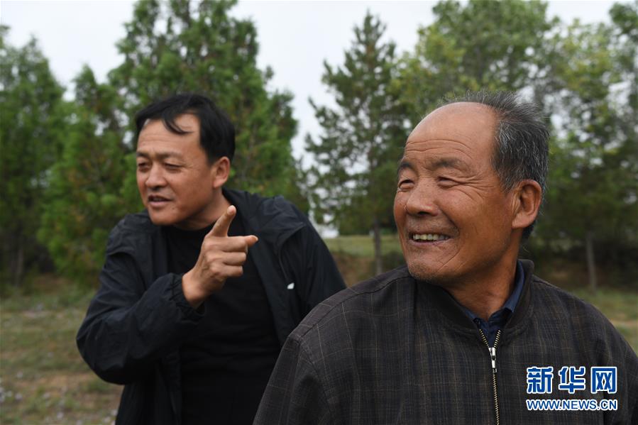 9月26日,龙洲镇龙二村党支部书记王海军(左)介绍齐军祥时说:“有人多次要购买老齐的这些树,但他就是一棵也不卖!” 陕北榆林市靖边县龙洲镇深处有一座山叫齐山,当地人认为这里是附近齐姓人的老家。66岁的退休教师齐军祥居住在齐山的土窑洞里,20年来他植树修路,完成了绿化一座荒山的奇迹。 2000年,齐军祥因身体原因提前退休后,来到偏僻的齐山上,独居荒山土窑洞,并开始植树造林。期间,他拿出自己的全部收入,在3.5平方公里的土地上栽植了30多万株松树与柏树,修建了长达60公里、可以让车辆直接开上山顶的土路,打了14座淤地坝以及一口深达300多米的水井。 如今,山上的树苗已长成大树,有人要出资千万元购买,齐军祥一口回绝:“我不能卖,卖了连自己都对不住。我要把齐山的绿留给子孙后代。” 新华社记者 陶明 摄
