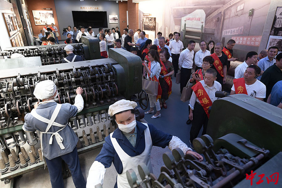9月26日,杭州,劳模工匠与各界代表正在参观纺织厂女工劳动竞赛的复原场景。