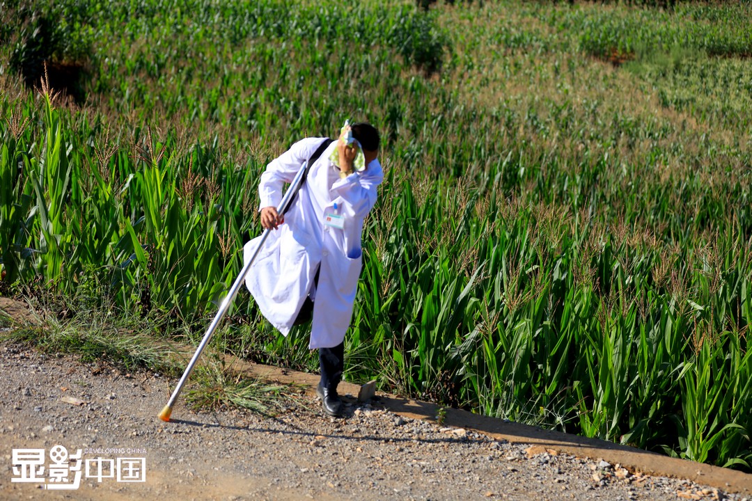 时间走长了,李红奎的手经常会被磨出水泡,但他说不觉得辛苦,特别是看到患者病情好转的时候,感觉很开心。图为李红奎在随访途中休息擦汗。