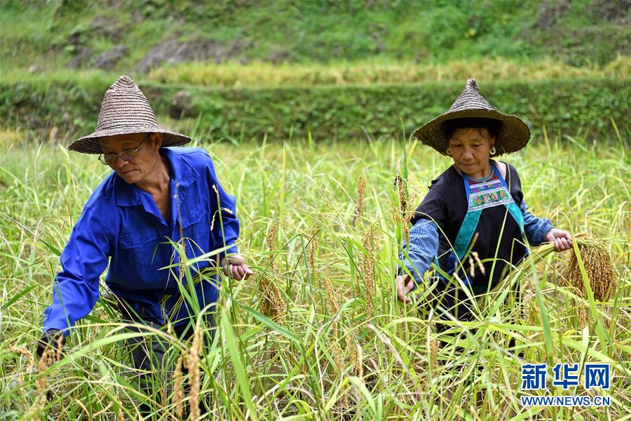 梁安合(左)和老伴梁英迷在收谷子(9月10日摄)。 新华社记者 李鑫 摄