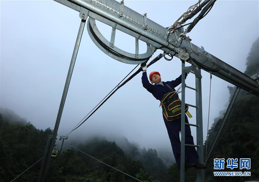 9月27日,湖南张家界武陵源景区杨家界索道工作人员在检查索道运行情况。 国庆、中秋假期临近,湖南张家界旅游管理部门在完善疫情防控、限量接待、分时段预约等服务保障措施的基础上,提前组织企业对景区内高空客运索道进行安全隐患排查,保障假期游览安全。 新华社发(吴勇兵 摄)