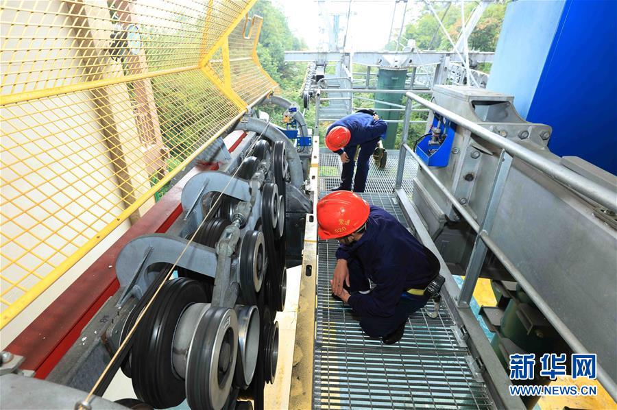 9月27日,湖南张家界武陵源景区杨家界索道工作人员在检查索道运行情况。 国庆、中秋假期临近,湖南张家界旅游管理部门在完善疫情防控、限量接待、分时段预约等服务保障措施的基础上,提前组织企业对景区内高空客运索道进行安全隐患排查,保障假期游览安全。 新华社发(吴勇兵 摄)