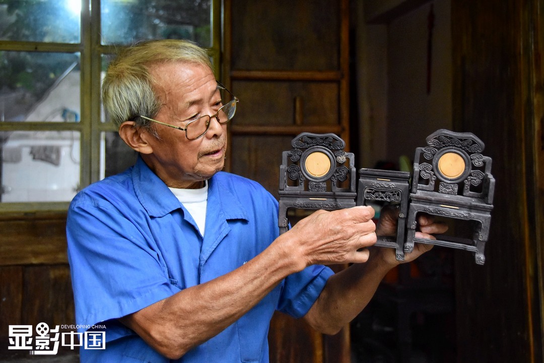 凭着手艺人的匠心,杨纪岳制作了一批微型红木家具和亭子。作品受到很多行家和村民的关注,每当村里有大活动时,他的微型木器会在现场展示,精湛的制作工艺引来很多人的围观,纷纷为老木匠点赞。