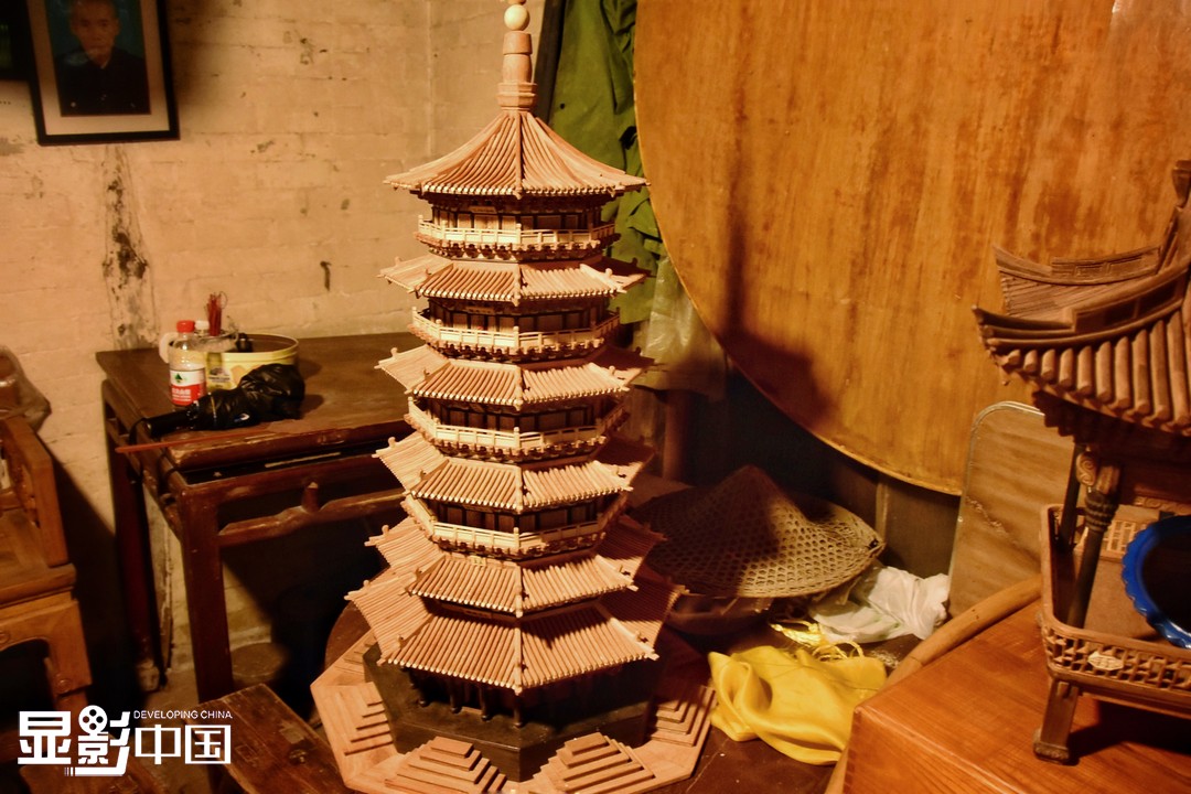杨纪岳用一年半时间精心制作了一座高90厘米的微缩版“应县木塔”,整座木塔上万个构件选用紫檀、花梨、黄杨等木材,并用古老的榫卯结构工艺组合而成。