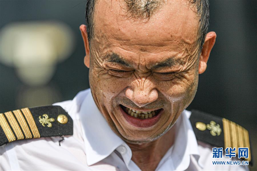 9月26日,在穿着防护装备引航一艘从境外驶来的货船顺利靠泊海南洋浦港后,引航员林道民脱下防护装备,满头是汗。新华社记者 蒲晓旭 摄