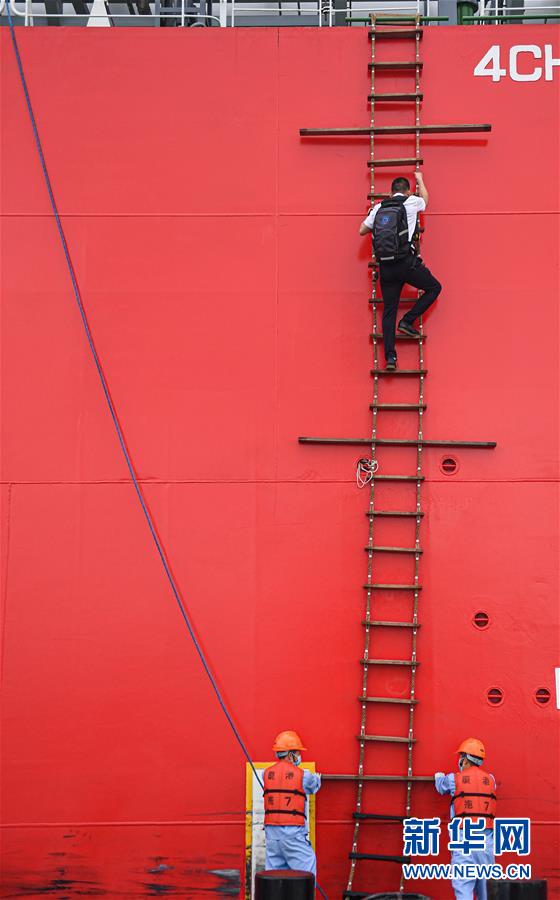 9月25日,在引航一艘大型船只进入海南洋浦港靠泊后,引航员林宏品通过软梯向船下的一艘拖轮攀爬,以乘拖轮继续执行其他引航任务。新华社记者 蒲晓旭 摄