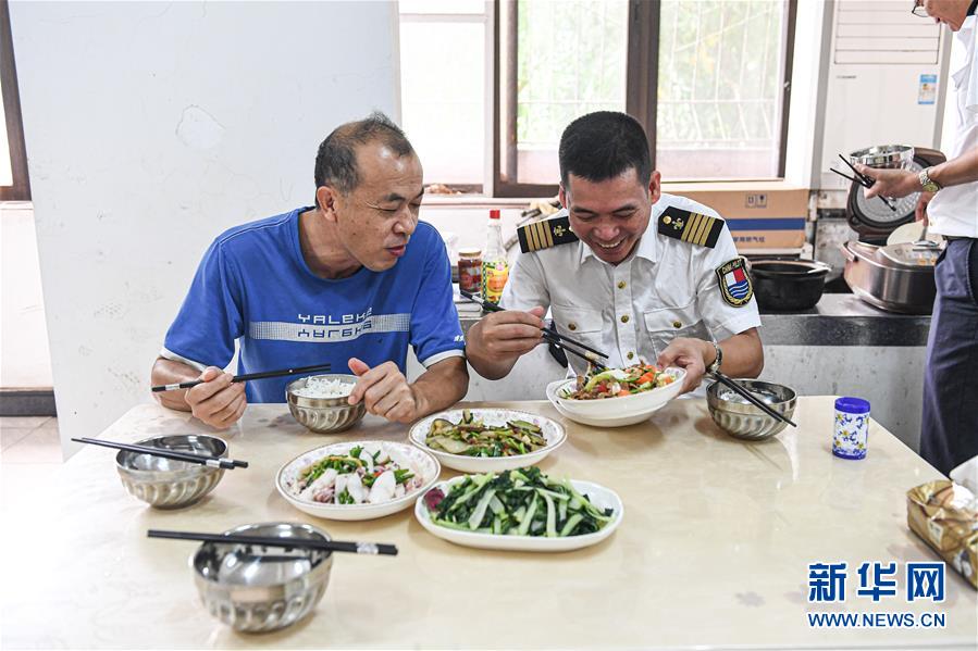 9月25日,完成当天的引航任务后,引航员林宏品(右)回到海南洋浦的驻地,在午餐时与引航员林道民(左)闲聊。新华社记者 蒲晓旭 摄