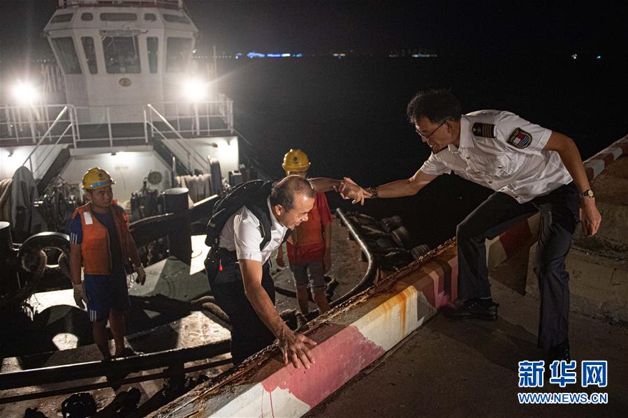 9月23日晚,引航员林道民(左二)在完成一次离港引航并乘拖轮返回海南洋浦港小铲滩码头后,引航员陈英华(右一)拉其上岸。新华社记者 蒲晓旭 摄