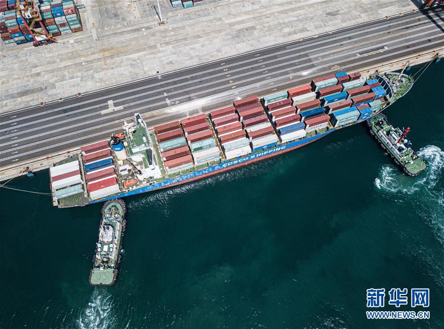 9月23日,引航员指挥两艘拖轮辅助一艘集装箱船靠泊在海南洋浦港小铲滩码头(无人机照片)。新华社记者 蒲晓旭 摄