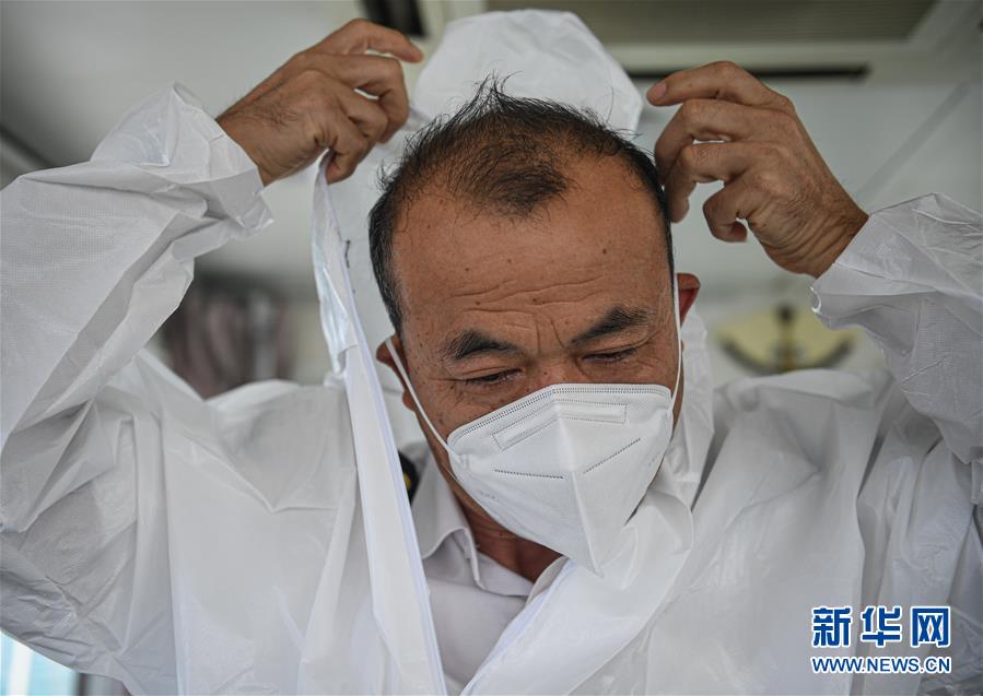 9月26日,引航员林道民在一艘行驶在海南洋浦港海域的拖轮上穿戴防护装备,他即将登上一艘从境外驶来的货船并对其进行引航。新华社记者 蒲晓旭 摄