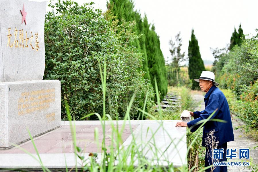 胡兆伦在擦拭无名烈士墓(9月15日摄)。新华社记者 刘军喜 摄