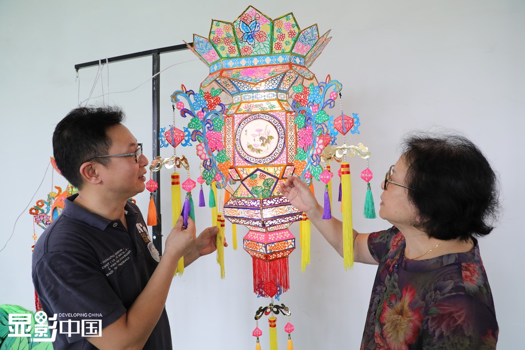 鱼鳞灯是佛山彩灯独有特色,贴上千片的鱼鳞,灯光亮起,鱼鳞特有的纹路泛出美妙的色泽。杨玉榕为了让鱼鳞灯在不照明的时候具备观赏性,创作了《五彩鱼鳞灯》。受母亲启发,儿子创新出《春暖花开喜盈盈》。图为《春暖花开喜盈盈》。