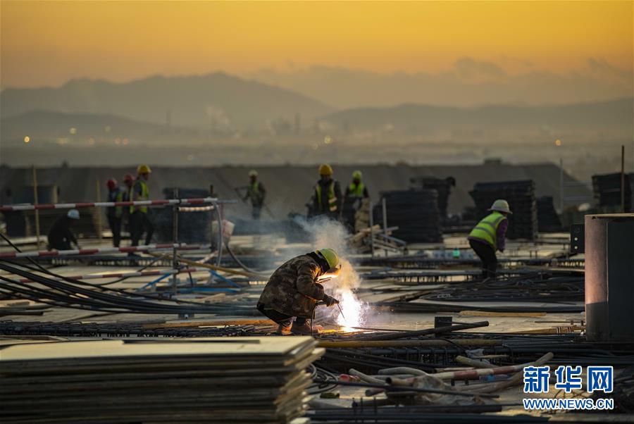 在新疆乌鲁木齐机场改扩建工程航站楼施工现场,中建三局的工人在焊接钢筋(10月2日摄)。新华社记者 胡虎虎 摄