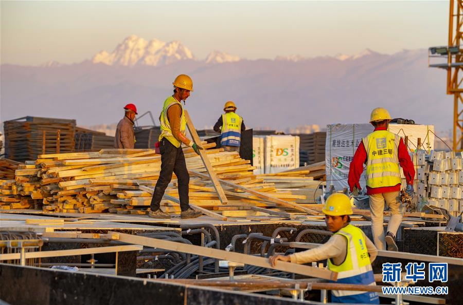 工人在新疆乌鲁木齐机场改扩建工程航站楼施工,远方的博格达峰清晰可见(10月2日摄)。新华社记者 胡虎虎 摄