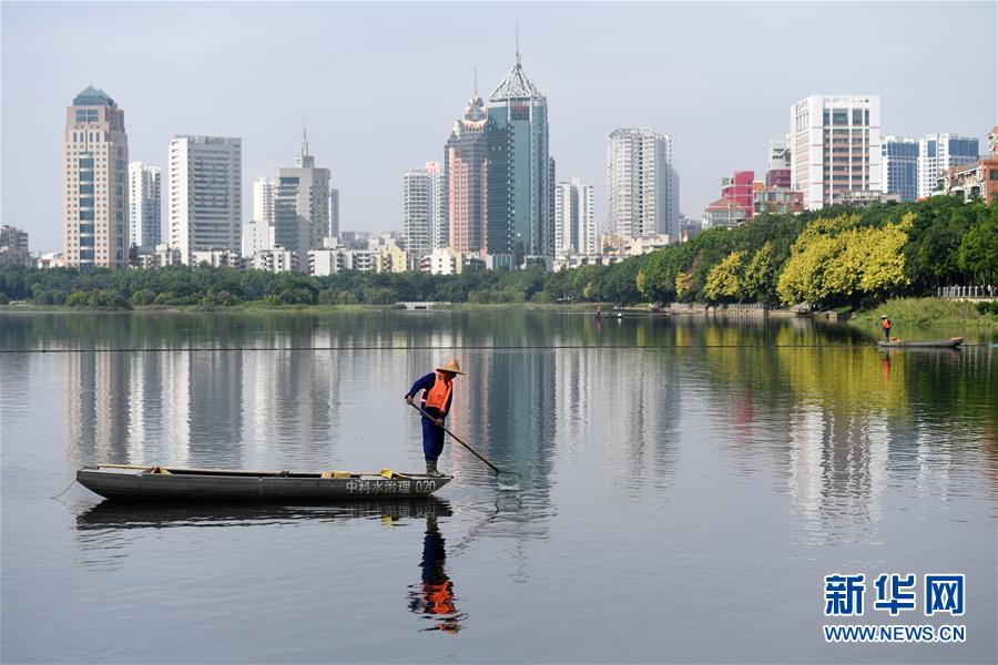 10月2日,在广西南宁市南湖,工人进行水面保洁。 长假期间,不少人依然坚守工作岗位,在忙碌中度过假期。 新华社记者 陆波岸 摄
