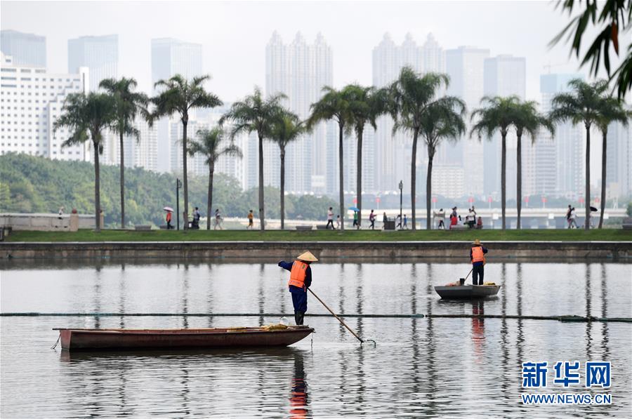 10月2日,在广西南宁市南湖,工人进行水面保洁。 长假期间,不少人依然坚守工作岗位,在忙碌中度过假期。 新华社记者 陆波岸 摄