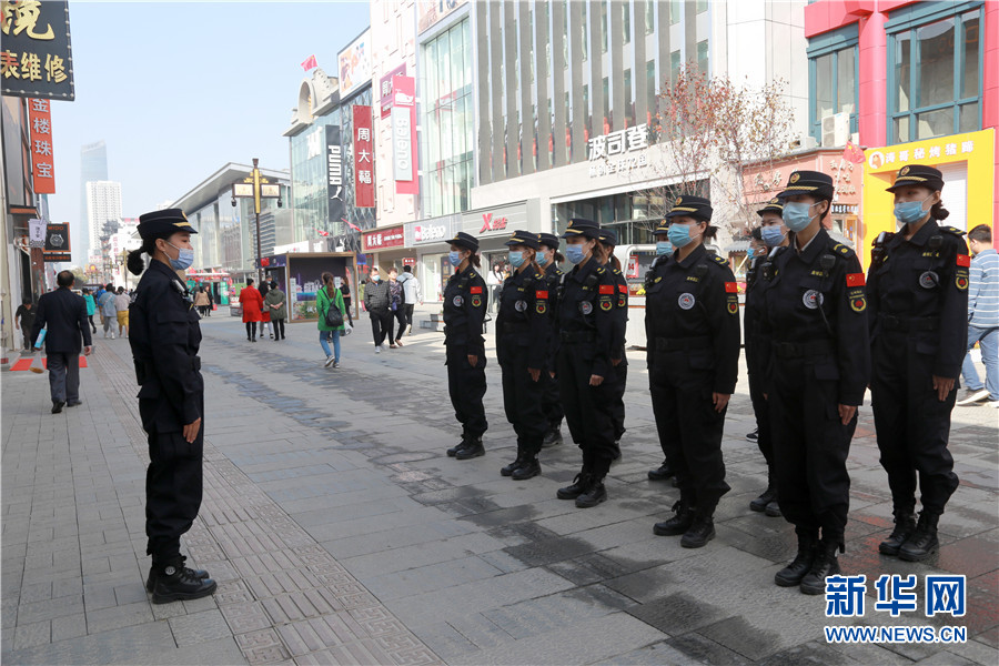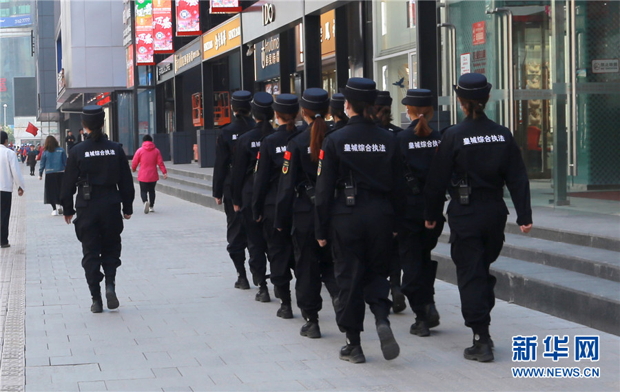 图为女子礼仪巡查特勤中队在中街巡逻。新华网刘舒摄