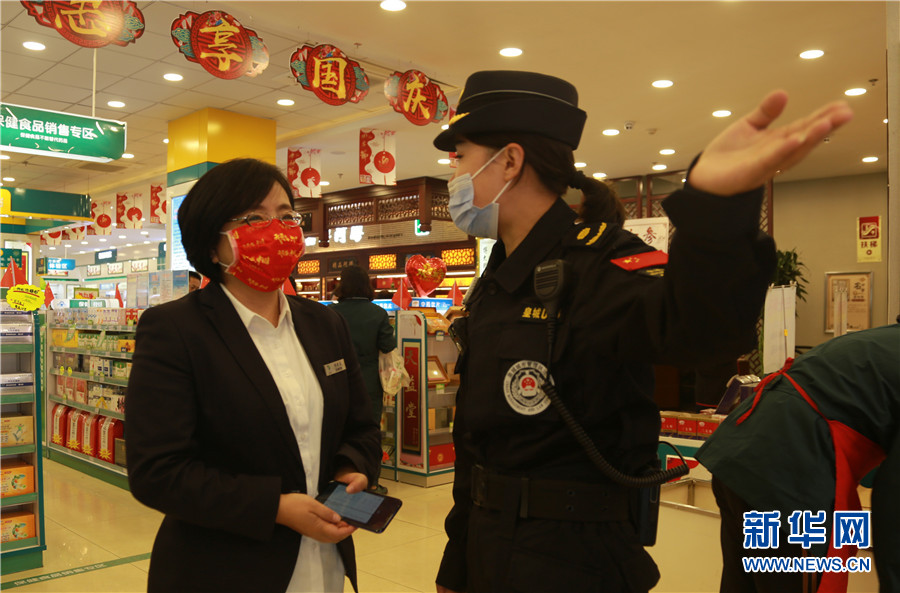图为女子礼仪巡查特勤中队副队长聂霜向商家宣传城市管理相关政策。新华网刘舒摄