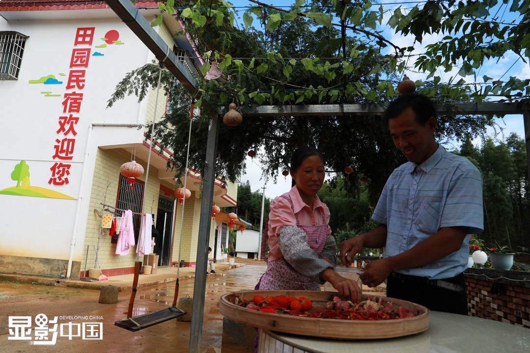 但由于交通不便,长期以来,这里3万余亩客家梯田的稻浪美景并不为外人所熟知。10年前,面朝大山,唐彦忠选择离开家乡外出打拼。期间,他和妻子辗转于广东惠州、东莞、河源等地,鞋厂、五金厂、炼钢厂、塑料厂……都曾留下他们的身影。2019年9月,当家乡的上堡梯田景区竣工营业后,唐彦忠和妻子决定回到家乡。图为唐彦忠和妻子江春华正在自家院子里晾晒干货。新华网 王凯丰摄