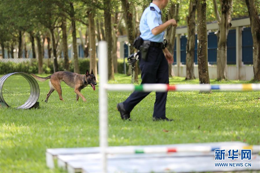 香港警犬队领犬员张仲然带着警犬Loeska训练(9月10日摄)。新华社记者 吴晓初 摄
