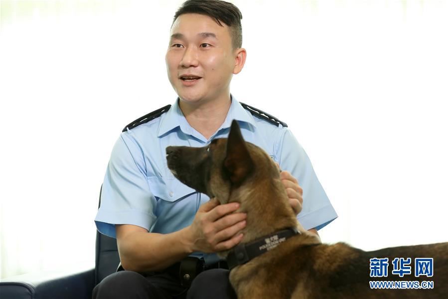 香港警犬队领犬员张仲然带着警犬Loeska接受采访(9月10日摄)。新华社记者 吴晓初 摄