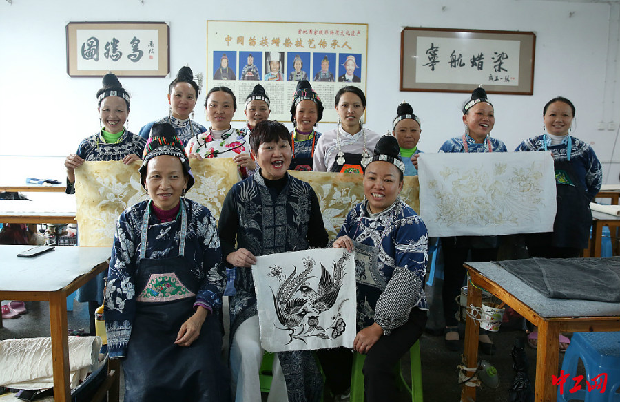 2020年10月11日,在贵州省黔东南丹寨县宁航蜡染工坊,宁曼丽(前中)与画娘们共同展示绘制的蜡画。黄晓海/视觉中国
