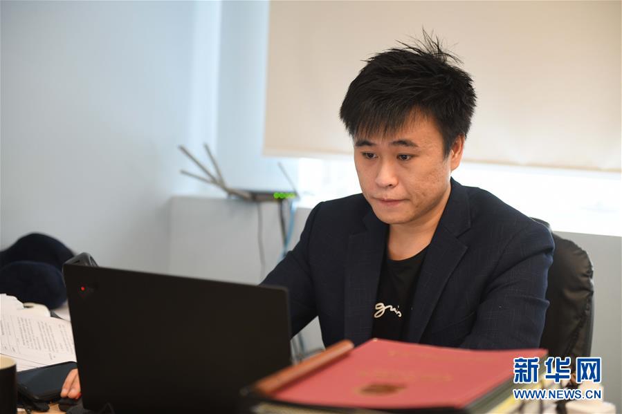 郭玮强在办公室处理公司业务(9月10日摄)。新华社记者 卢汉欣 摄