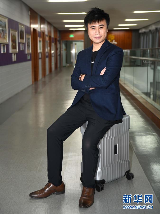 郭玮强坐在他研发的智能行李箱上(9月10日摄)。新华社记者 卢汉欣 摄