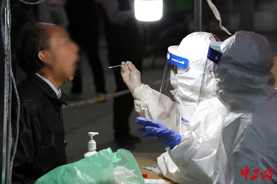 10月12日晚,山东青岛市南区八大关街道红岛路社区,工作人员在为辖区居民做核酸检测取样。检查前居民需要出示身份证登记,手机、电话号码登记,然后排队从喉咙部提取检查测试样本。