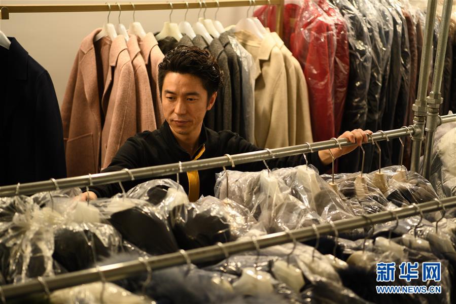 10月12日,河北廊坊云裳小镇精品服饰区商户黄鹏程在库房整理服装。新华社记者 朱旭东 摄