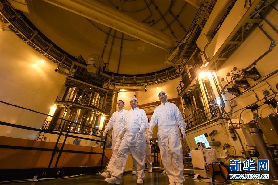 2019年4月12日,在深圳大亚湾核电站2号机组核心区,乔素凯(中)和团队成员结束工作准备离开。新华社记者 毛思倩 摄