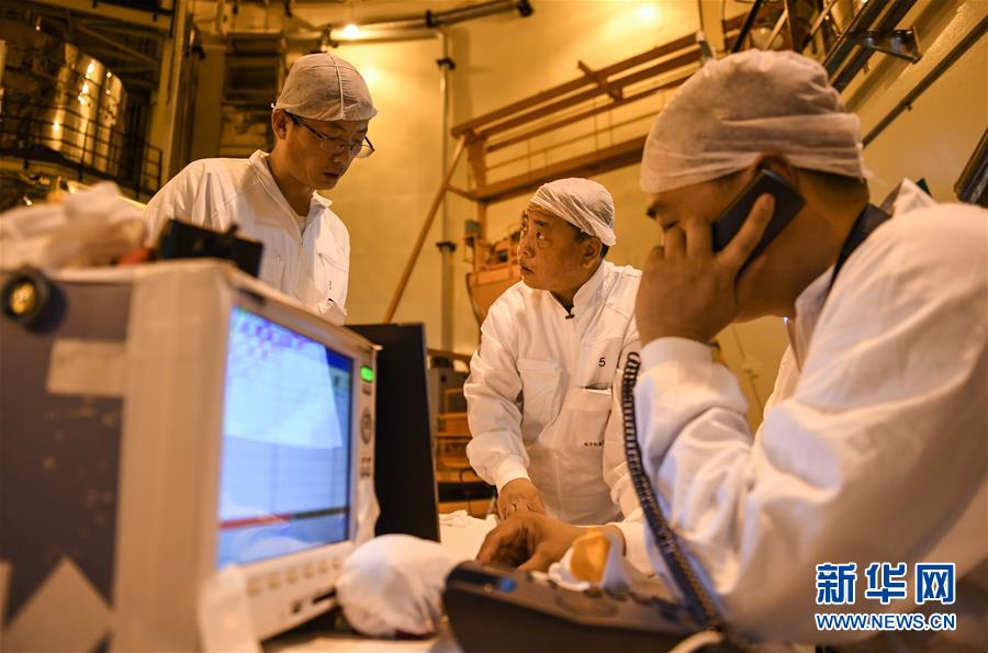 2019年4月12日,在深圳大亚湾核电站2号机组核心区,乔素凯(中)与团队成员一起了解换料的情况。新华社记者 毛思倩 摄