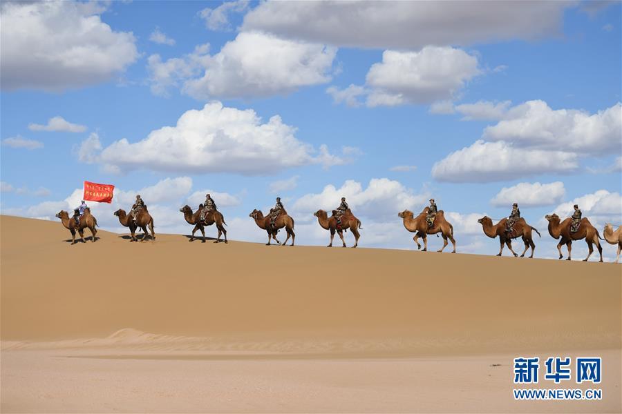 10月15日,阿拉善右旗边防民兵驼兵排民兵、阿拉善边境管理支队民警和当地牧民进行骆驼应用训练。 当日,阿拉善右旗边防民兵驼兵排联合阿拉善边境管理支队民警和当地牧民,在位于内蒙古阿拉善右旗的巴丹吉林沙漠北部进行骆驼应用训练演练,实地检验了当地民兵和民警在沙漠腹地执行巡护任务的能力。 新华社记者 任军川 摄
